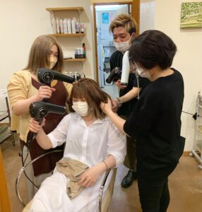 スタッフのヘアスタイルをみんなで変え合うカットデーの日でした‼️スタッフの芹田を秒速乾かし中…